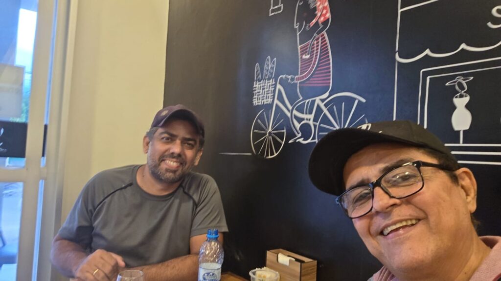 Colunista Marcos Peixoto em reunião na Pão & Cia, em Crato, ontem à tarde, com o empresário de mídias digitais, Auto Junior, que vai comandar o lado LED de nosso Feijão Preto do MP 2026.