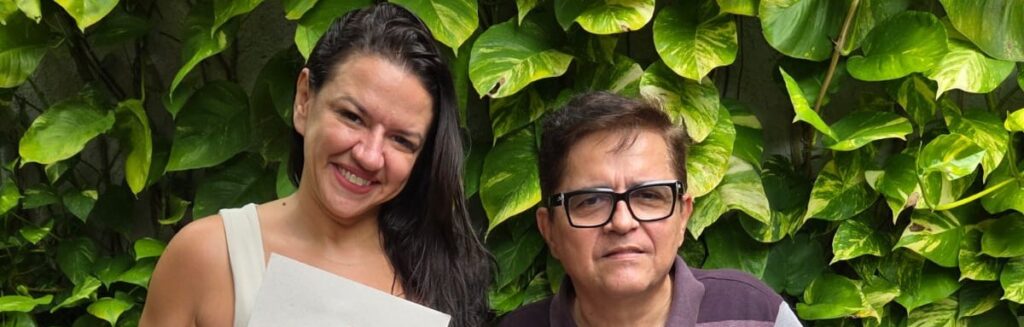 Colunista Marcos Peixoto e a entrevistada Kelly de Oliveira Luz Linhares.