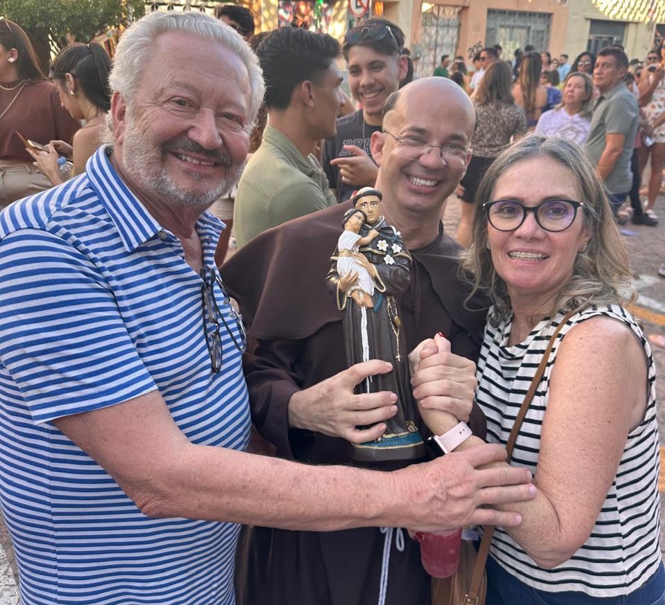 Casal Rommel Bezerra de Menezes e Silvana Gurgel em plena efervescência ‘santantoniana’ recebendo fluidos divinos de religioso que se fazia presente no meio da multidão, portando imagem do santo casamenteiro barbalhense. Vou te contar…