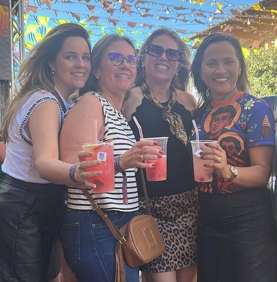 Jovialíssimas senhoras Renatinha Mendes, Silvana Gurgel, Patrícia Mendonça e Regina Barros com o coloridinho dos copos de coquetéis muito bem transados por coqueteleiro especialmente contratado para serví-las desse tipo de bebidinha própria para mulheres elegantes.