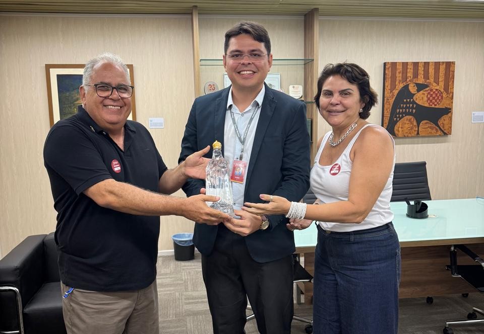 Casal caririeense Figueiredo Correia Junior e Camila apresentando ao Vandir Farias a nova embalagem da Água Mineral Cambará com formato de Nossa Senhora