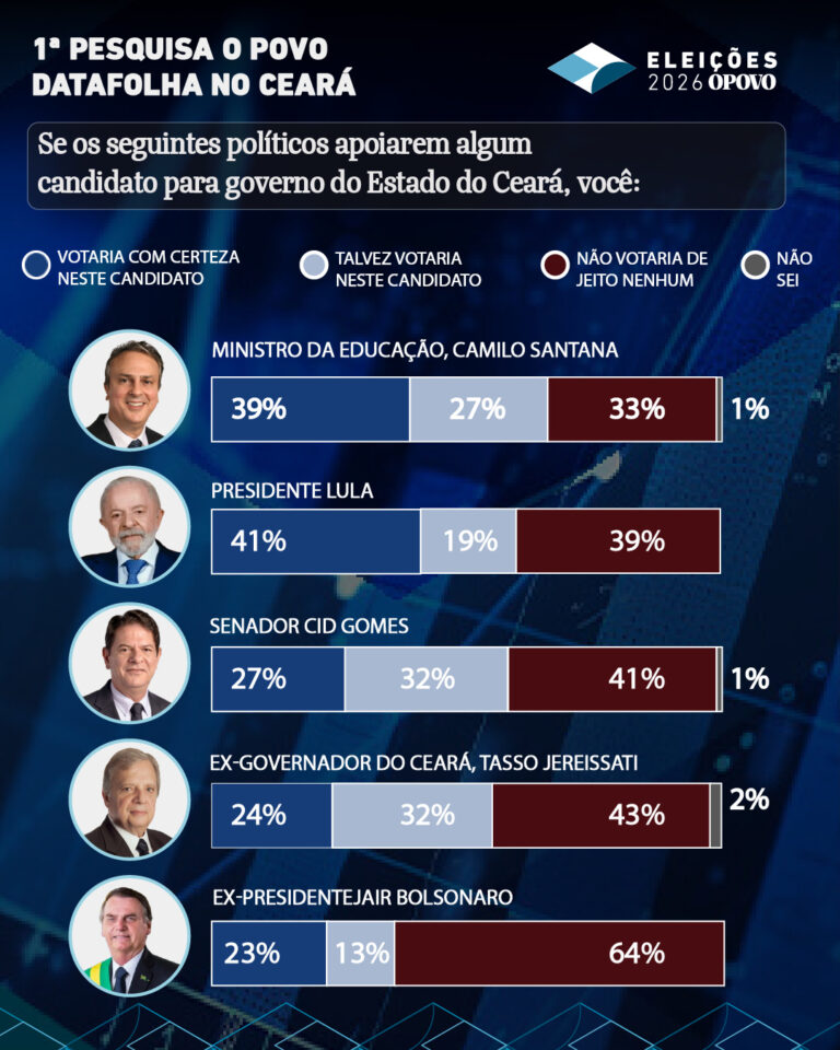Ciro Gomes, diante da pesquisa reveladora – que aponta o ex-presidente Bolsonaro com pouquíssima influência no quadro da sucessão cearense, chegando a apenas 23%, enquanto Lula aparece com 41%, Camilo com 39% e Cid Gomes com 27% —, teve sua posição bastante impactada. Essa realidade mexeu muito com o suposto candidato oposicionista, que, dos bolsonaristas, quer apenas o suporte de Capitão Wagner e André Fernandes para robustecer seu número de votos na capital. De Bolsonaro, assim como sempre agiu Capitão Wagner, Ciro Gomes quer manter distância, pois ter seu nome ligado a ele provoca prejuízos.