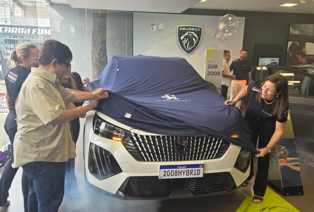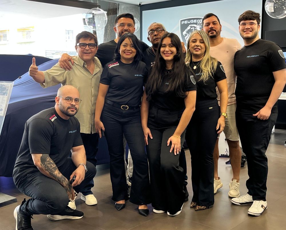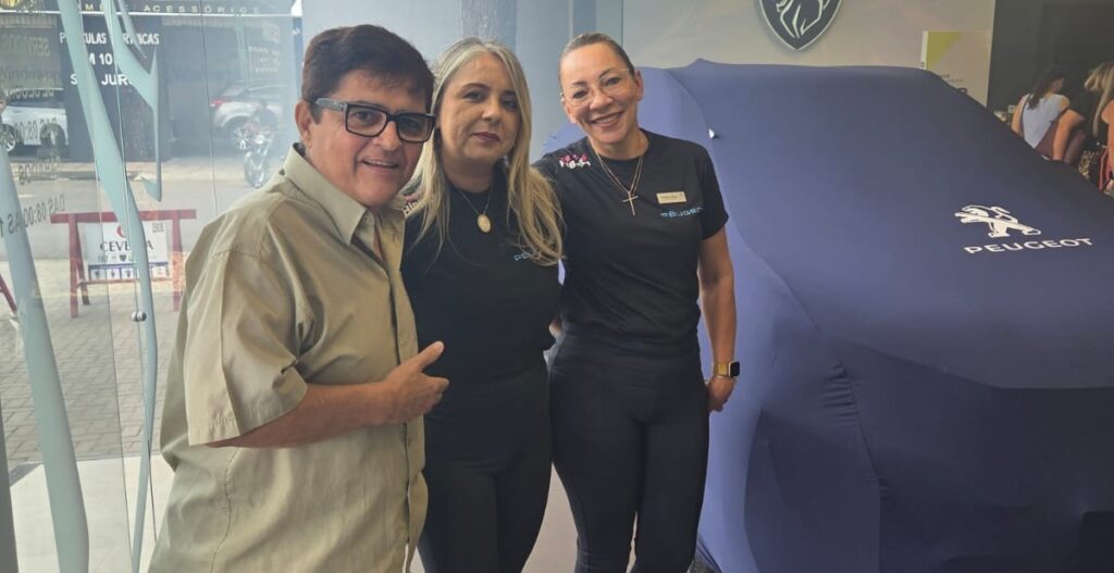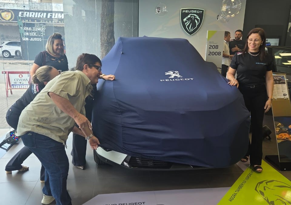 Marcos Peixoto e a equipe feminina Cevema desenvelopando o novo veículo Peugeot, a vedete da festa