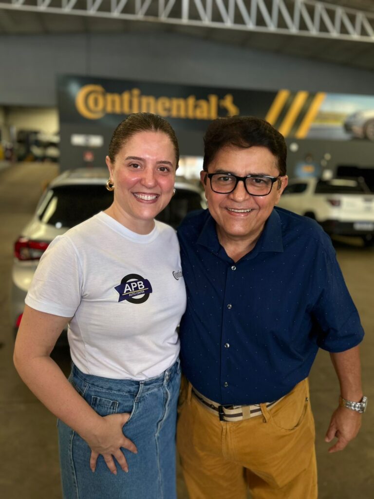 Empresária Aretha Primo de Brito e Marcos Peixoto comemorando mais um apoio de suas lojas de pneus ao Nosso Feijão Preto 2026.