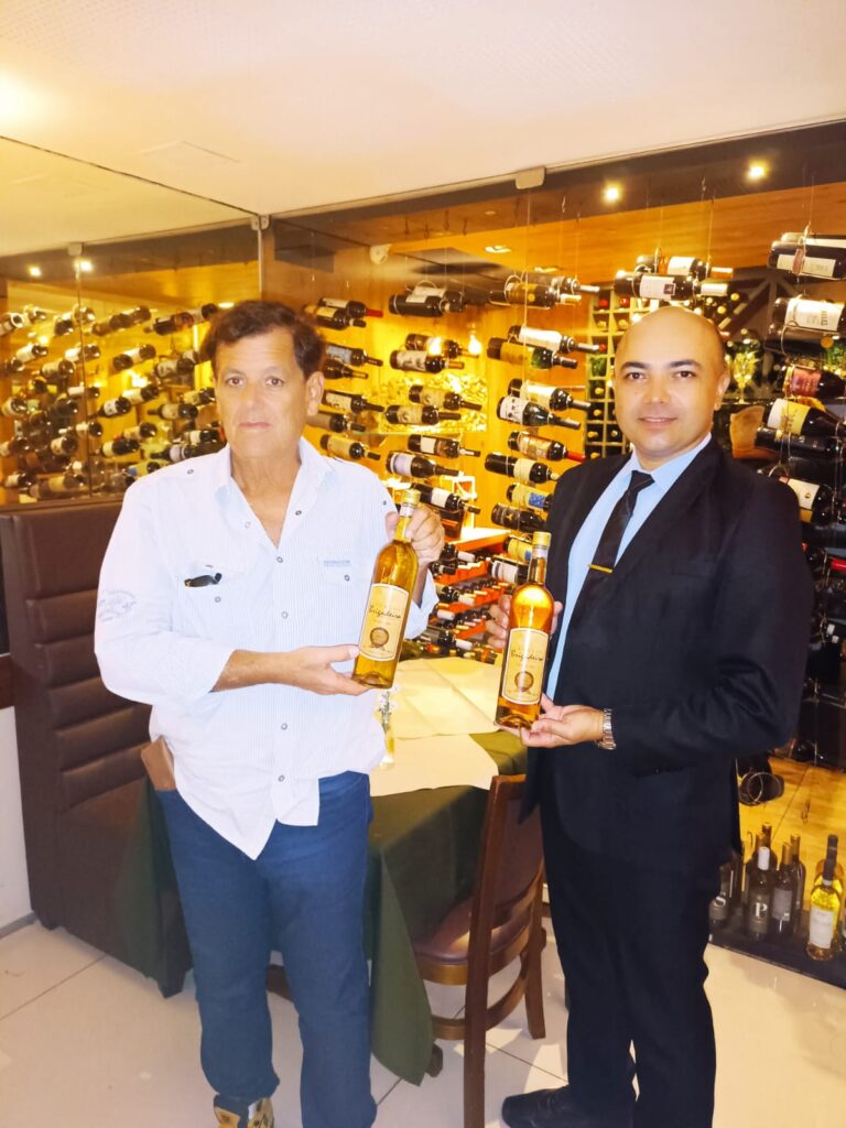Grande gentleman Átilia Macedo Rache, entregando às mãos do metre Brito(Pasto & Pizzas) exemplares da Cachaça Brigadeira tanto para constar da adega especial do ristorante como para presentear este colunista com garrafas contendo este néctar dos deuses.