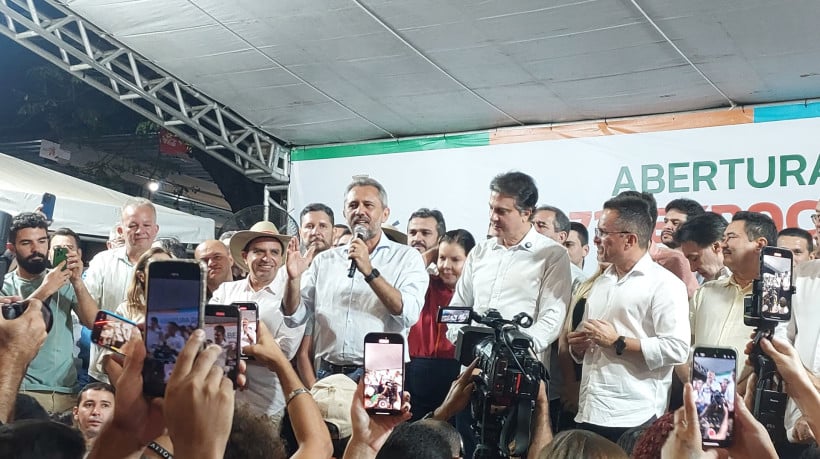 Governador Elmano de Freitas, ministro da Educação Camilo Santana e o prefeito André Barreto abrindo oficialmente a Exposição Centro Nordestina de Animais e Produtos Derivados do Crato