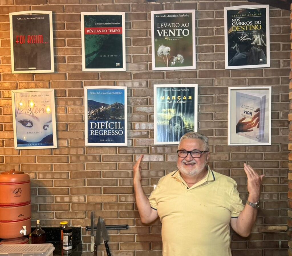 Mister Geraldo Ananias tendo como pano de fundo quadros em que destaca as suas obras literárias