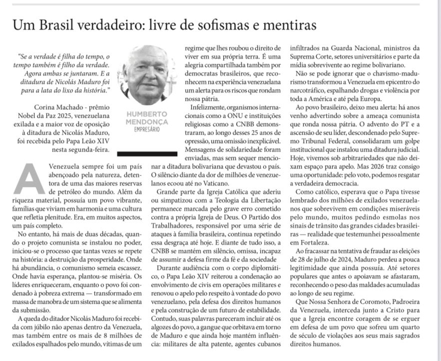 Em mais um artigo veiculado nas páginas de articulistas do jornal O Estado, o empresário cratense, radicado em Fortaleza, Humberto Mendonça, externa o seu desejo de um Brasil melhor, longe das mentiras e das fantasias enganosas. Vejamos: