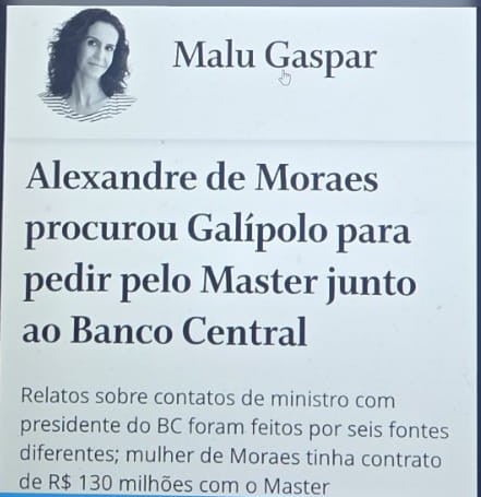 Mais cedo, a jornalista Malu Gaspar, do jornal O Globo, informou que Moraes teria procurado o presidente do Banco Central, Gabriel Galípolo, com o objetivo de interceder em favor do Banco Master, instituição que é alvo de investigações por suspeita de fraude.