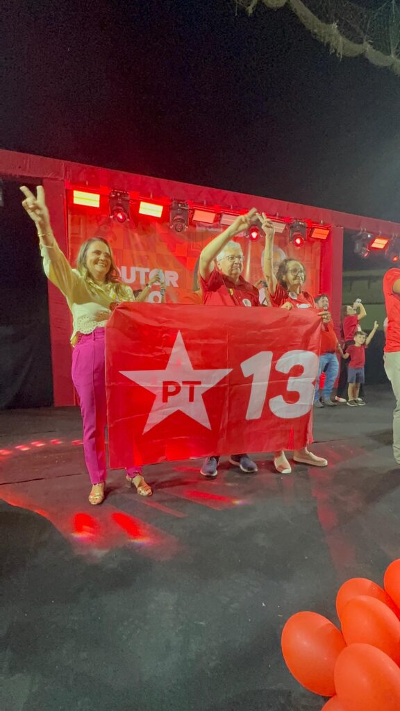 Candidato a prefeito Vandevelder Francelino ladeado por sua companheira de chapa Raquel Acássia e sua genitora, dona Aldenora
