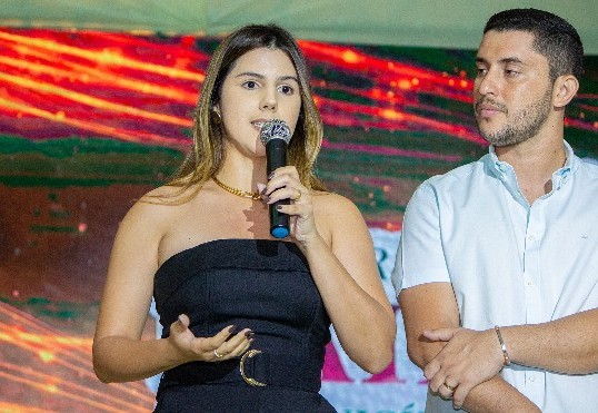 Prefeito Flavinho atento ao speech da esposa e primeira dama de Várzea Alegre, lady Ingrid Lemos