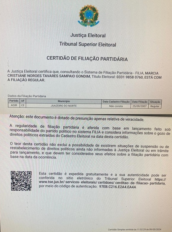 Ao contrário do que muitos radialistas e blogueiros estão afirmando sem a devida convicção, a empresária Marcia Norões Tavares é filiada sim ao partido AGIR, agremiação partidária aliada ao ex-governador Ciro Gomes(PDT) e que tem como presidente estadual no Ceará o prefeito José Sarto. Inclusive na coligação partidária armada na Barbalha pelo ex-prefeito Argemiro Sampaio(PSDB), o AGIR está inserido.