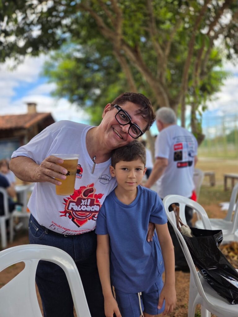 Colunista Marcos Peixoto ao lado do mascote feijoeiro 2025 Lucas Moreira