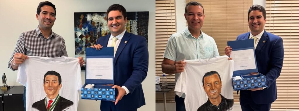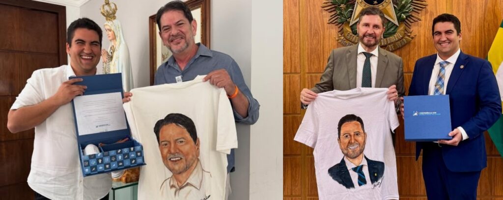 Matheus Leite brindou seus convivas palestrantes com camisa estampando os seus rostos. Uma boa ideia. Nos clics acima Matheus com o senador Cid Gomes e com o presidente da ALECE Romeu Aldigueri