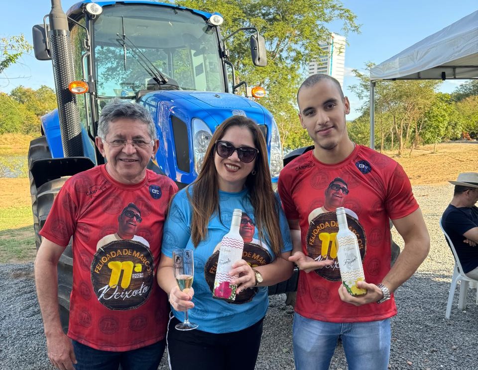 Ladislau Batista posa para as nossas lentes ao lado da mulher Irene e do filho Davi todos vestidinhos na camisa da XI Feijoada do Marcos Peixoto e apresentando o delicioso frisante que agilisou a sua degustação em nosso evento de 2024. Detalhe: na foto de manchete aparecem este colunista e o Batista vestindo a camisa da feijoada 2025.