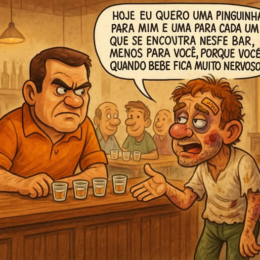 – Boa tarde. Hoje eu quero uma pinguinha para mim e uma para cada um que se encontra neste bar, menos para você, porque você quando bebe fica muito nervoso!!!