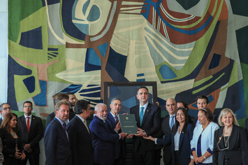 Ninguém registrou nem viu se Flávio Dino dirigiu-se a José Sarney. Nem para um simples e educado aceno. Na saída para o Salão Negro, Pacheco, Lula, Barroso e Moraes, tiraram foto com um imenso exemplar da Constituição, impresso especialmente para a solenidade.