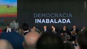 Discursou, sem dividir holofotes com ninguém, rodeado de ministros e de ministros aposentados, Ayres Brito e Rosa Weber, que presidia a Corte, na época do vandalismo.