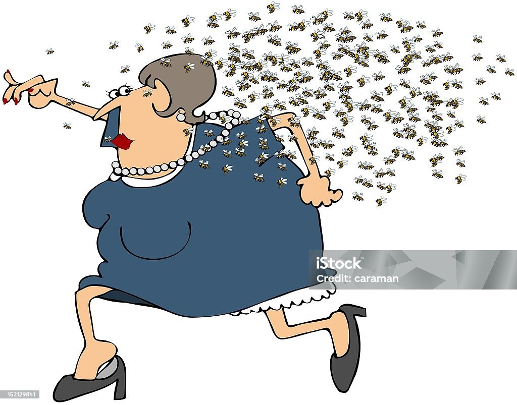 This illustration depicts a chubby woman being chased by a swarm of angry bees.