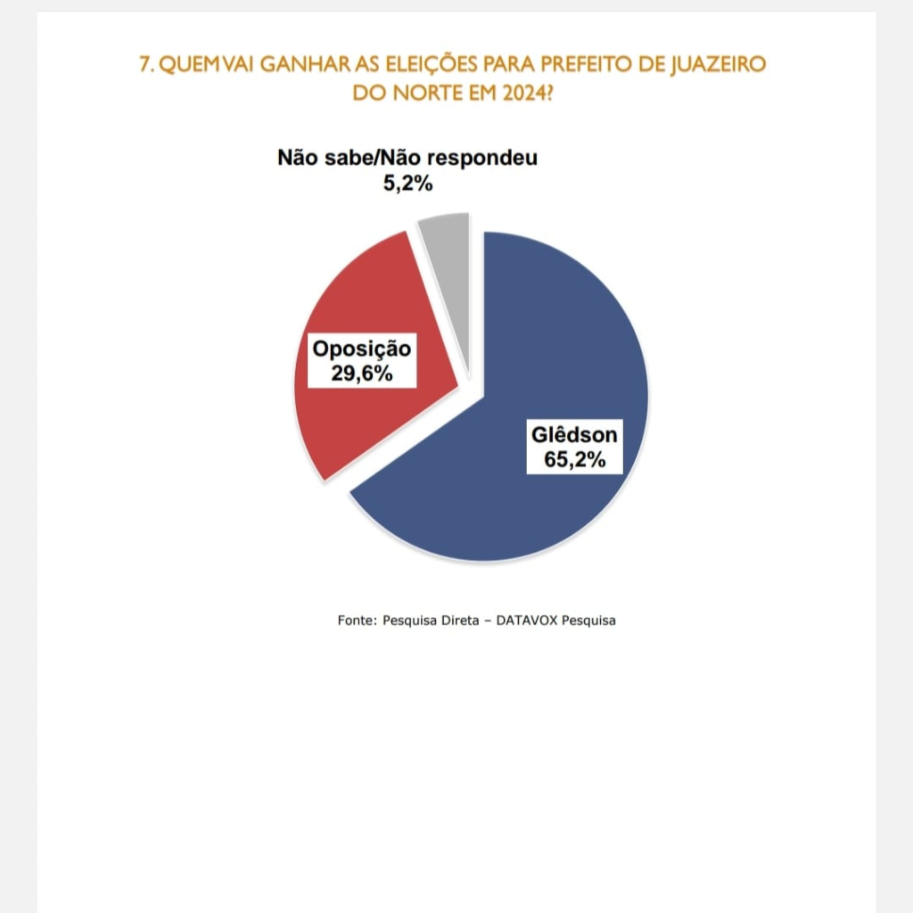 Mas vamos referendar o que afirmamos, através de pesquisa realizada nos últimos dias do ano pelo DATAVOX e enviada pelo instituto ao Eleições Brasil, Glêdson Bezerra (PODE) consolidou-se na disputa pela reeleição ampliando sua aprovação e intenção de votos, se compararmos aos dados de pesquisa publicada em setembro pela imprensa cearense.