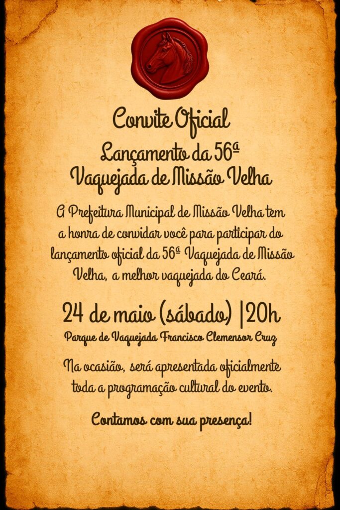 Mas hoje pintou em meu whatsApp mais uma oportunidade para novamente participar da propalada queda de gado de Missão Velha. Recebi simpático convite from prefeito Lourinho Macedo para participar no próximo sabadão, às 20 horas, no Parque de Vaquejada Clemensor Cruz, do lançamento oficial da 56ª Vaquejada de Missão Velha, a melhor do Ceará. Na ocasião, segundo o autor do convite, será apresentada oficialmente toda a programação cultural do evento. Fiquem atentos, pois em sociedade tudo se sabe. Sorry periferia!!!!!!