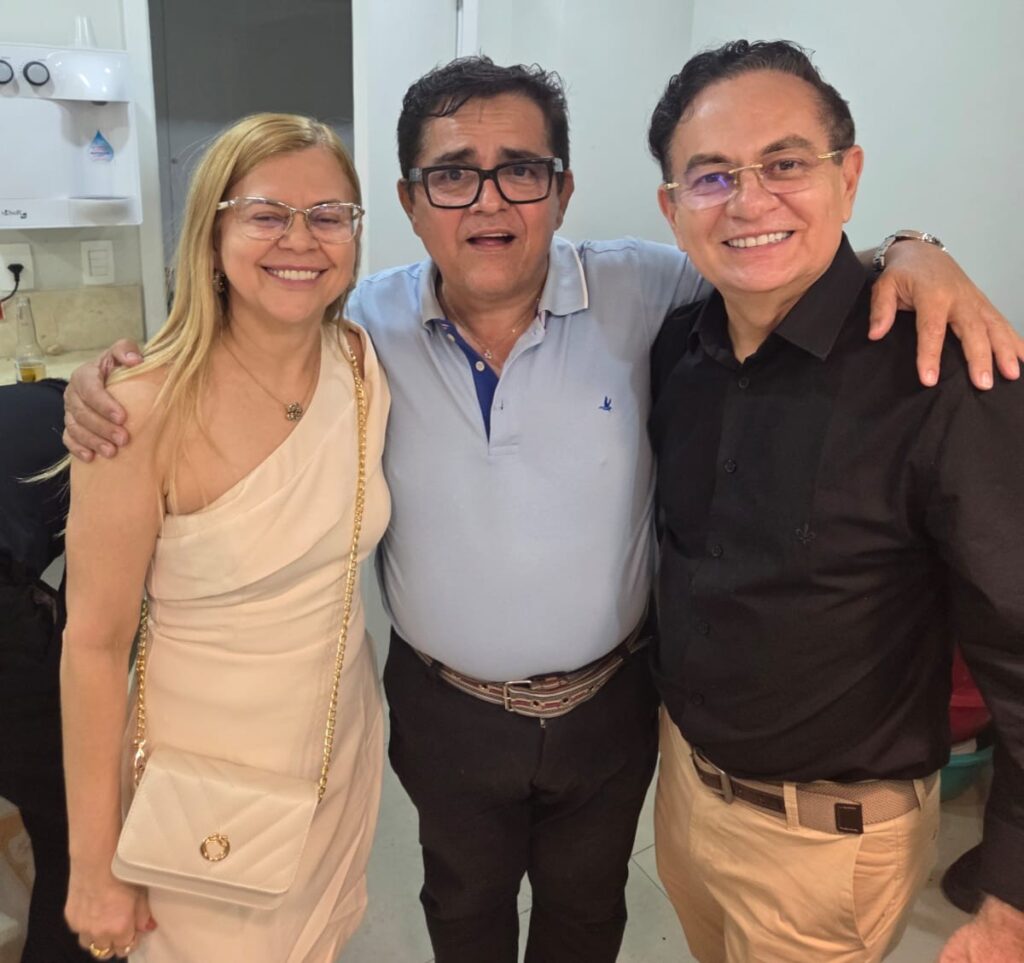 Aniversariante Lúcia Mendonça com Marcos Peixoto e o hermano Erasmo Mendonça que por sinal vem cuidando do look com esmero e os resultados são evidentes.