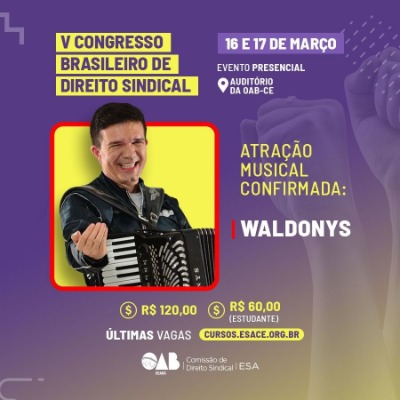 Nos dias 16 e 17 de março, o auditório da OAB-CE irá sediar o V Congresso Brasileiro de Direito Sindical. O evento, realizado em parceria com a Escola Superior de Advocacia do Ceará (ESA-CE), é aberto aos estudantes de direito, à advocacia, sindicalistas, trabalhadores e demais interessados no Direito Sindical e conta com a presença de autoridades e renomados palestrantes, oportunizando importantes discussões com o público. As inscrições podem ser feitas por meio do site da ESA-CE com taxa de R$ 120 para profissionais e R$ 60 para estudantes. Clique no link esace.org.br e faça a sua inscrição.